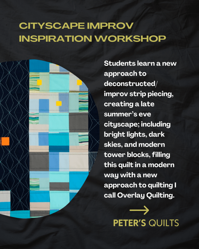 Cityscape measures 78 inches wide and 88 inches long and is composed with deconstructed improv strip piecing and creates a late summers eve cityscape, including raw edge appliquéd bright lights, dark sky’s and modern tower blocks.