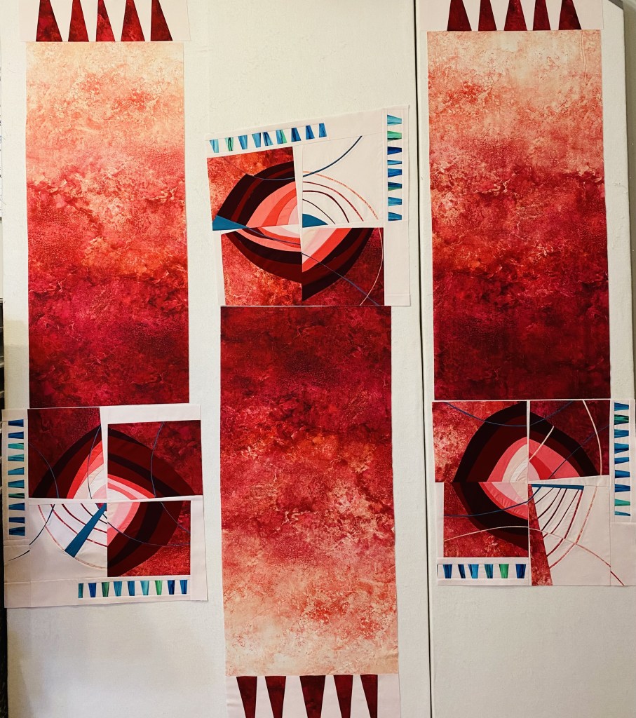 I arranged 5 diamond shaped units together to form the partial star and took the remaining 3 units and cut them up into 90 pieces. I used turned edge appliqué as it provides the greatest freedom of composition in creating the explosive star burst.