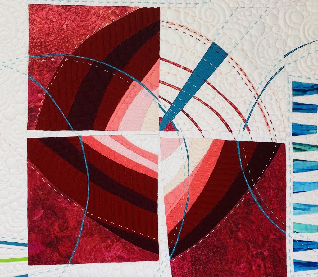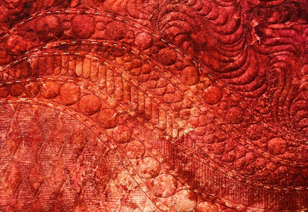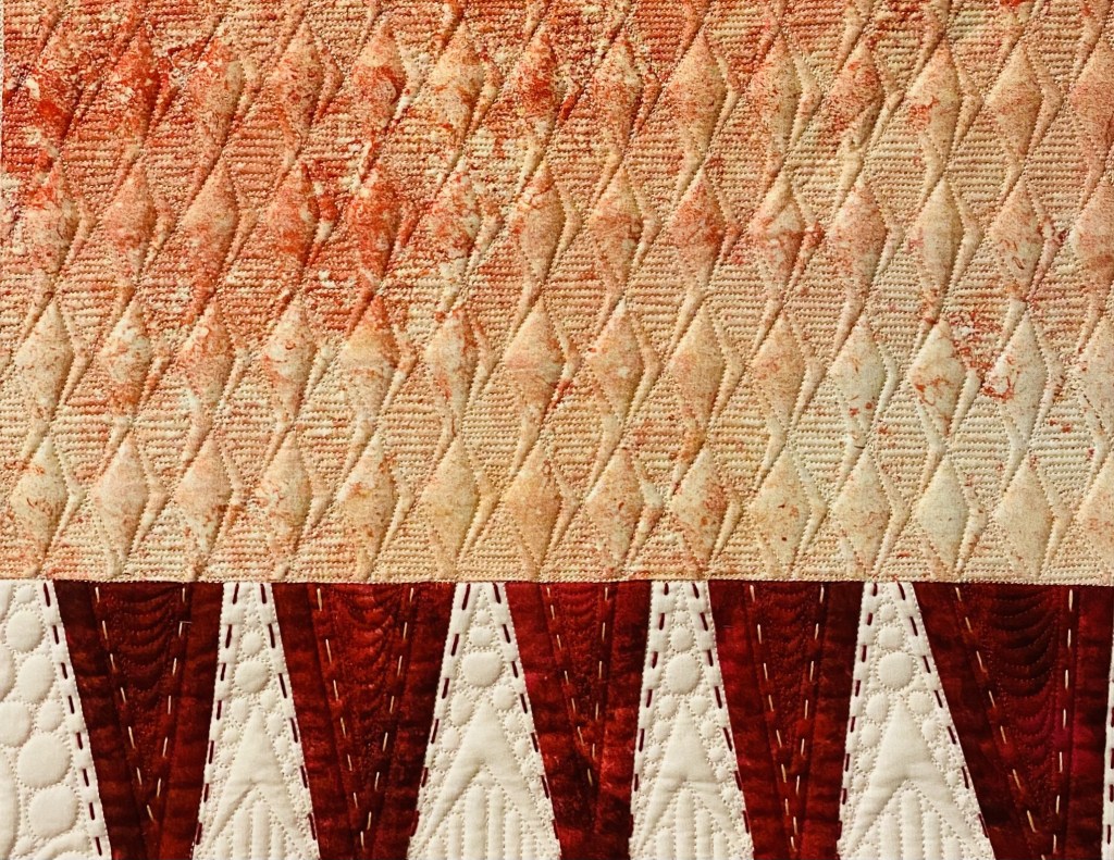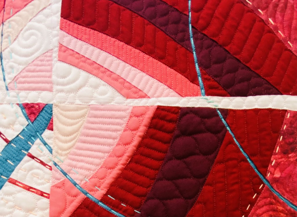 The expansive negative space is densely quilted with a variety of custom, hand guided quilting motifs. To highlight the large graphic design and add definition throughout the quilting, I used a heavy weight black thread to create the large circles, stars, double ended arrows and boarders that frame the asymmetrical design.