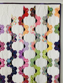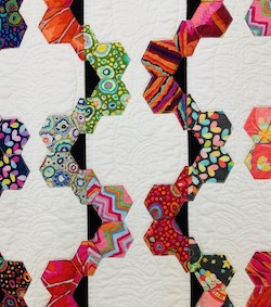 String is a large quilt measures 80 inches wide and 88 inches tall and honours the tradition and beauty of English Paper Pieced, Flower Garden Block, but with a innovative twist and modern aesthetic.