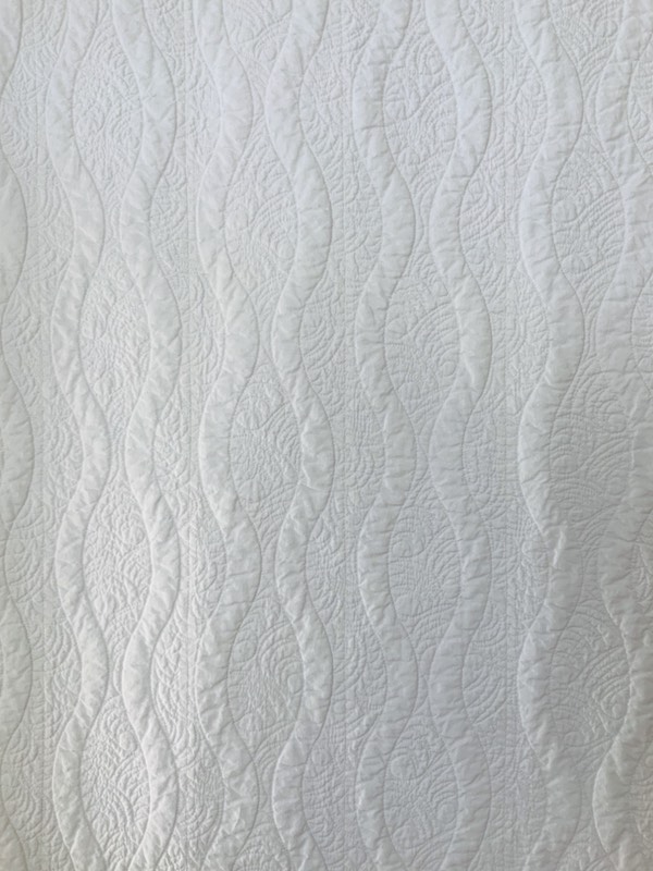 The overall composition allows for a supportive use of negative space and clear view of the various techniques used, including free motion quilting, ruler work quilting, stitch in the ditch and topstitch quilting used to Appliqué in place and create the “Strings” of half flower garden blocks.