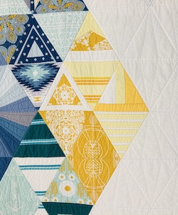 When designing Modern Triangle I played with creative piecing within each triangle to make them unique to themselves. To add interest to the walking foot straight line quilting, I used several colours of thread complementing the fabric colours. Modern Triangle measures 62 inches wide and 76 inches tall.