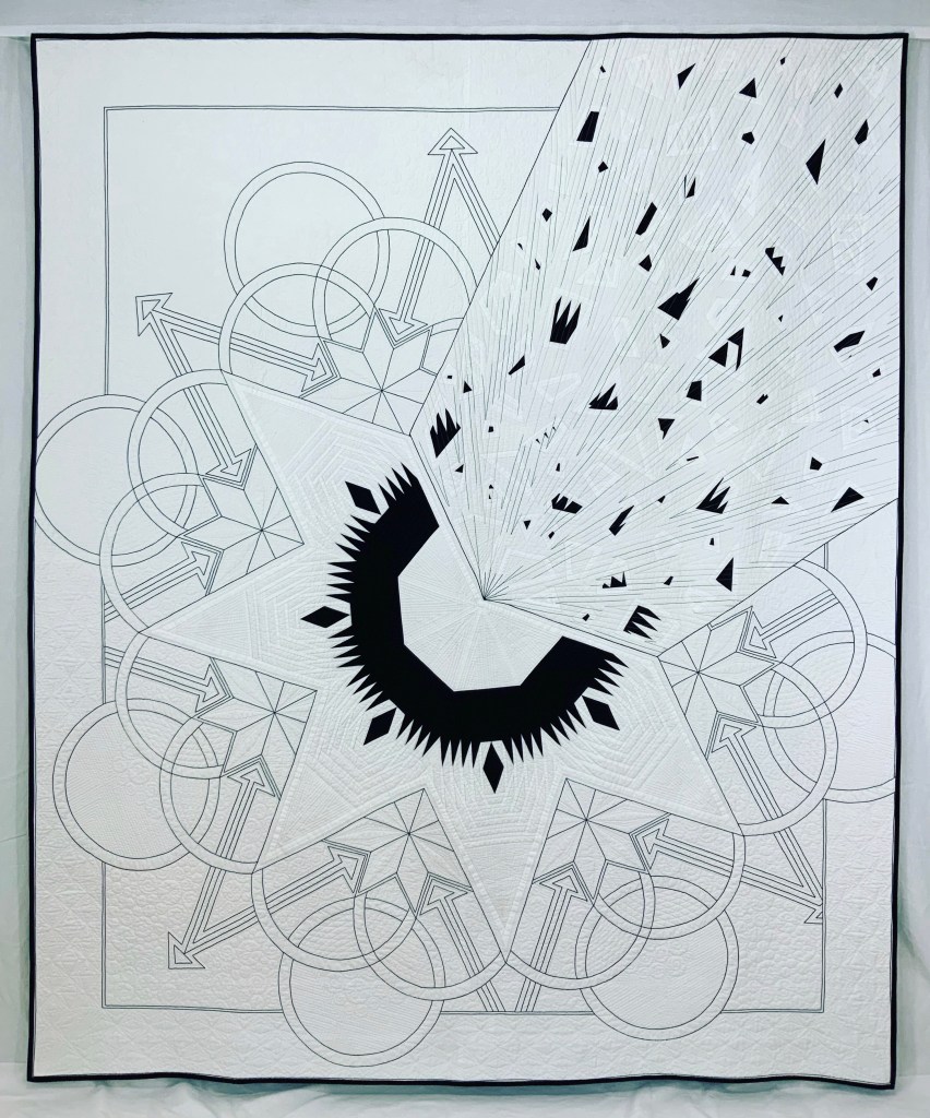 The expansive negative space is densely quilted with a variety of custom, hand guided quilting motifs. To highlight the large graphic design and add definition throughout the quilting, I used a heavy weight black thread to create the large circles, stars, double ended arrows and boarders that frame the asymmetrical design.