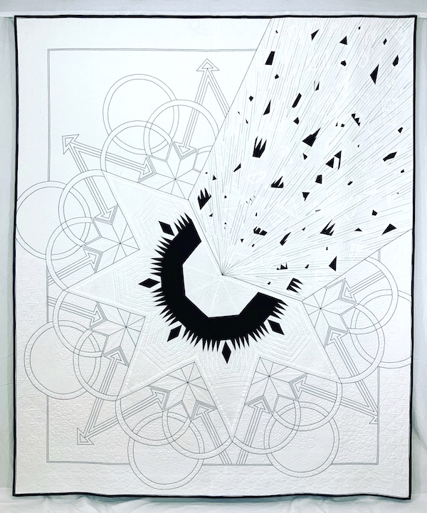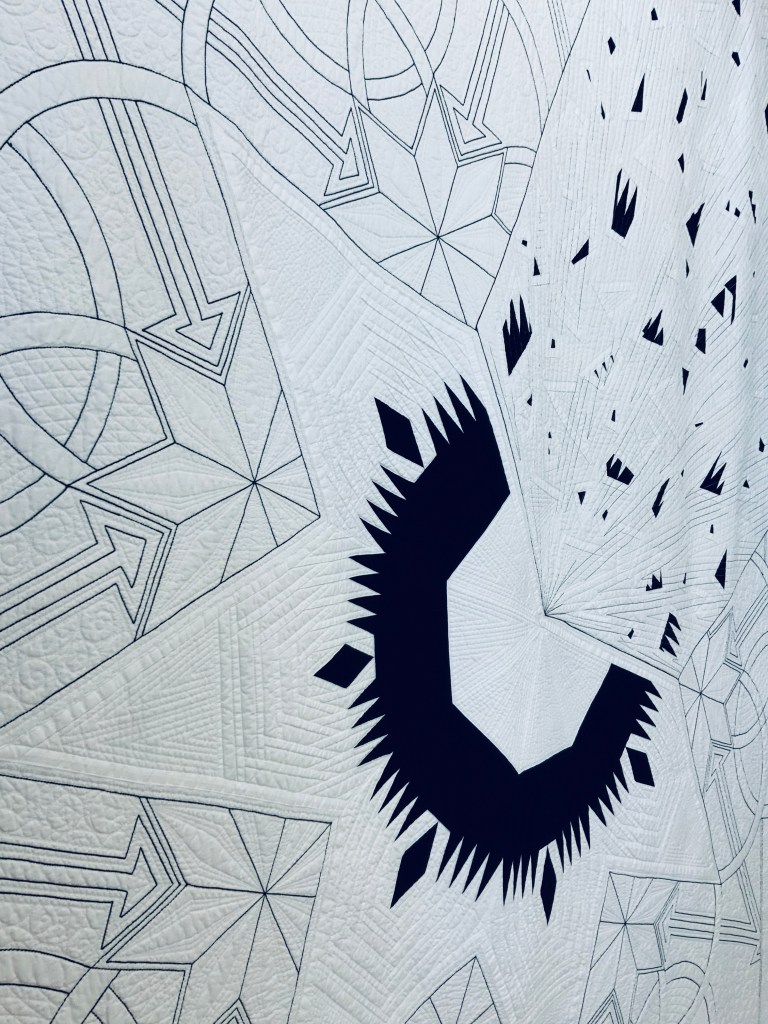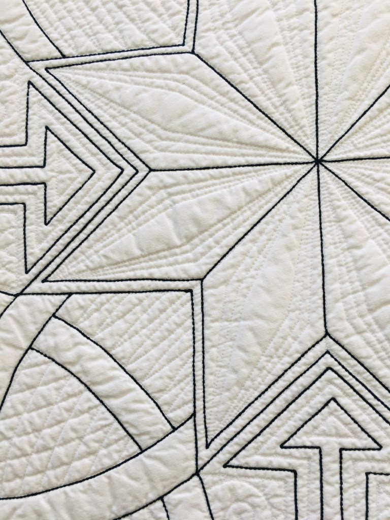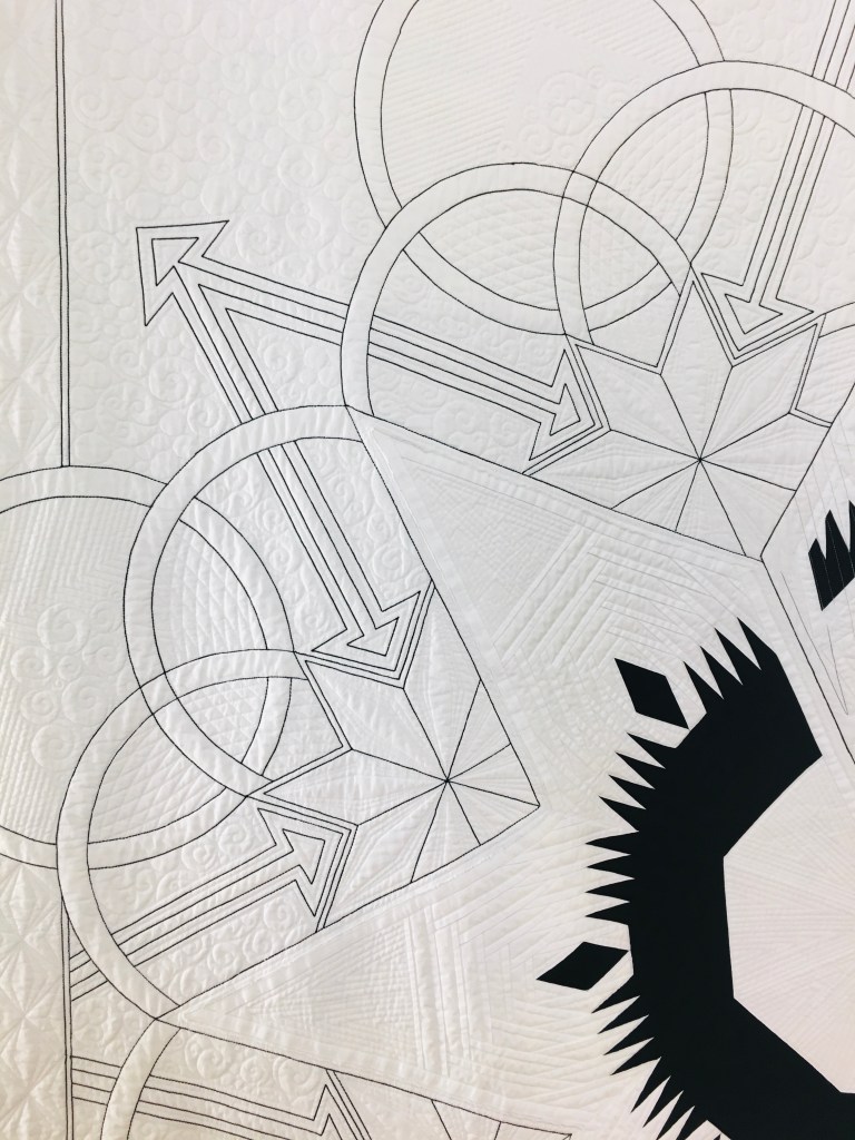 The expansive negative space is densely quilted with a variety of custom, hand guided quilting motifs. To highlight the large graphic design and add definition throughout the quilting, I used a heavy weight black thread to create the large circles, stars, double ended arrows and boarders that frame the asymmetrical design.