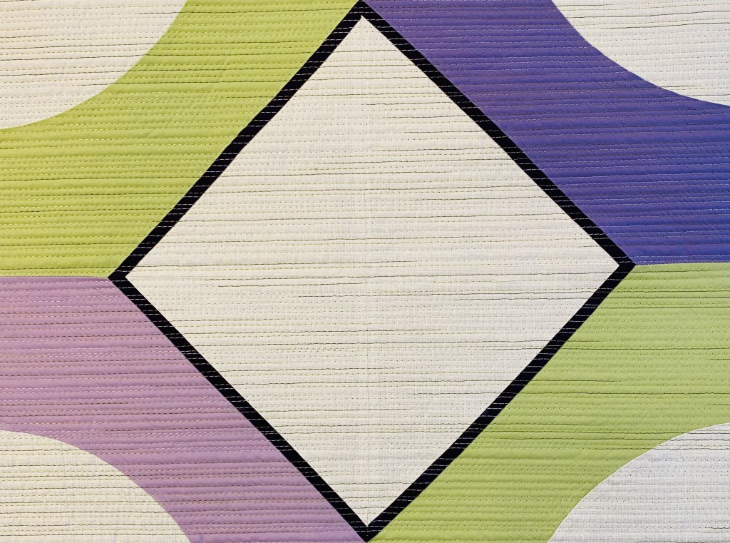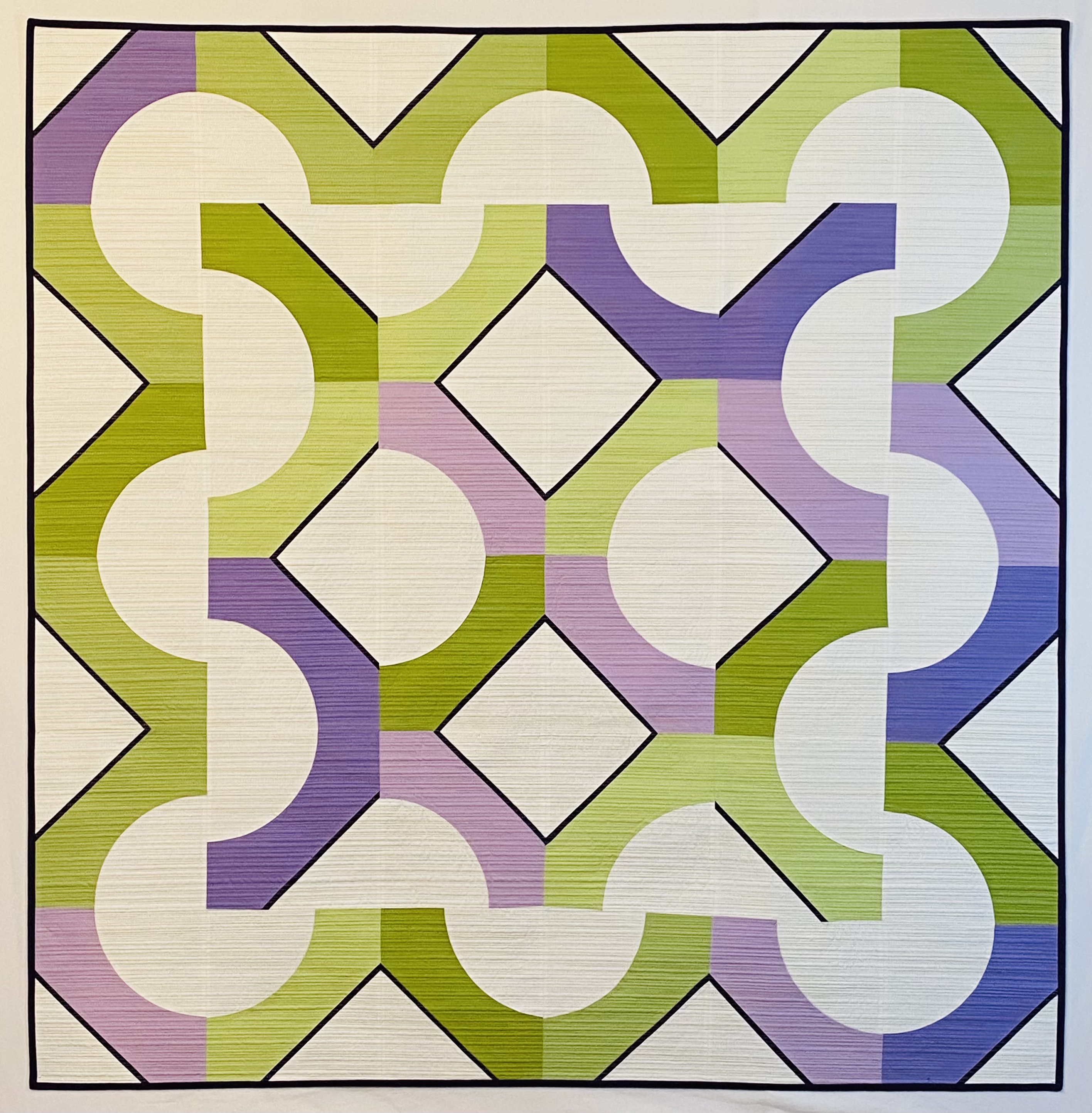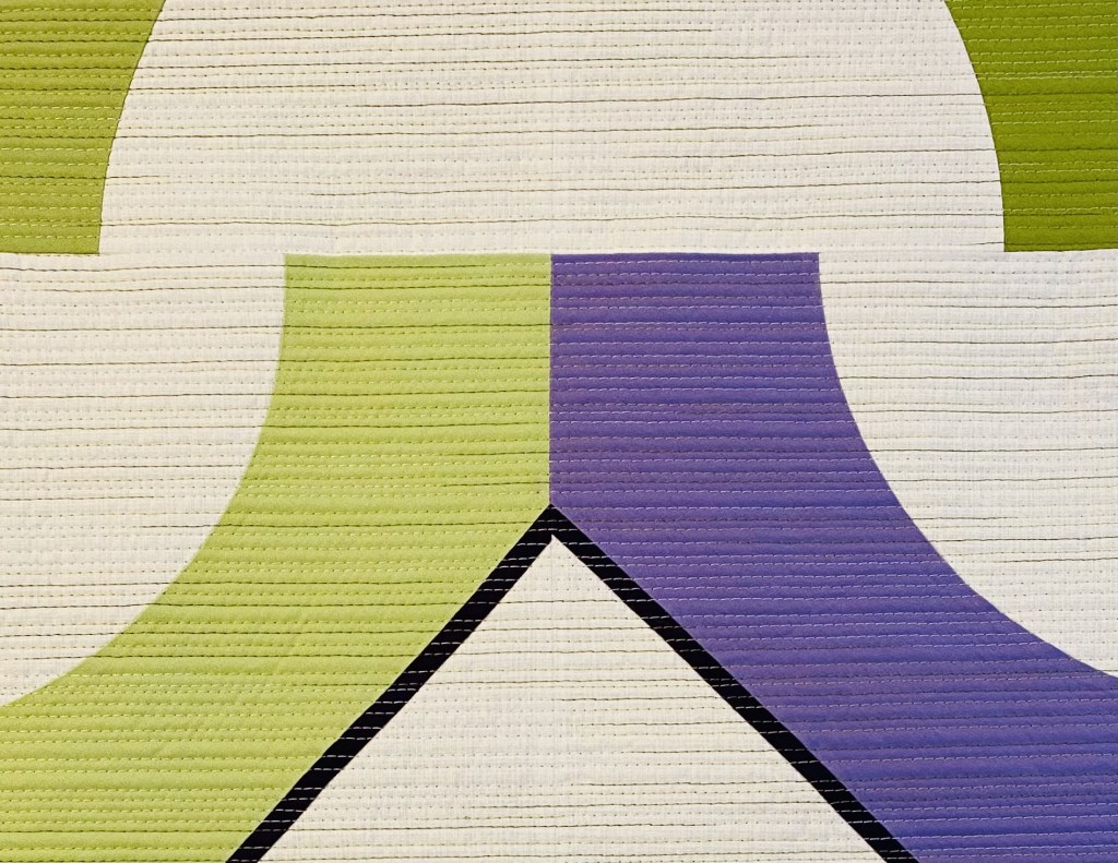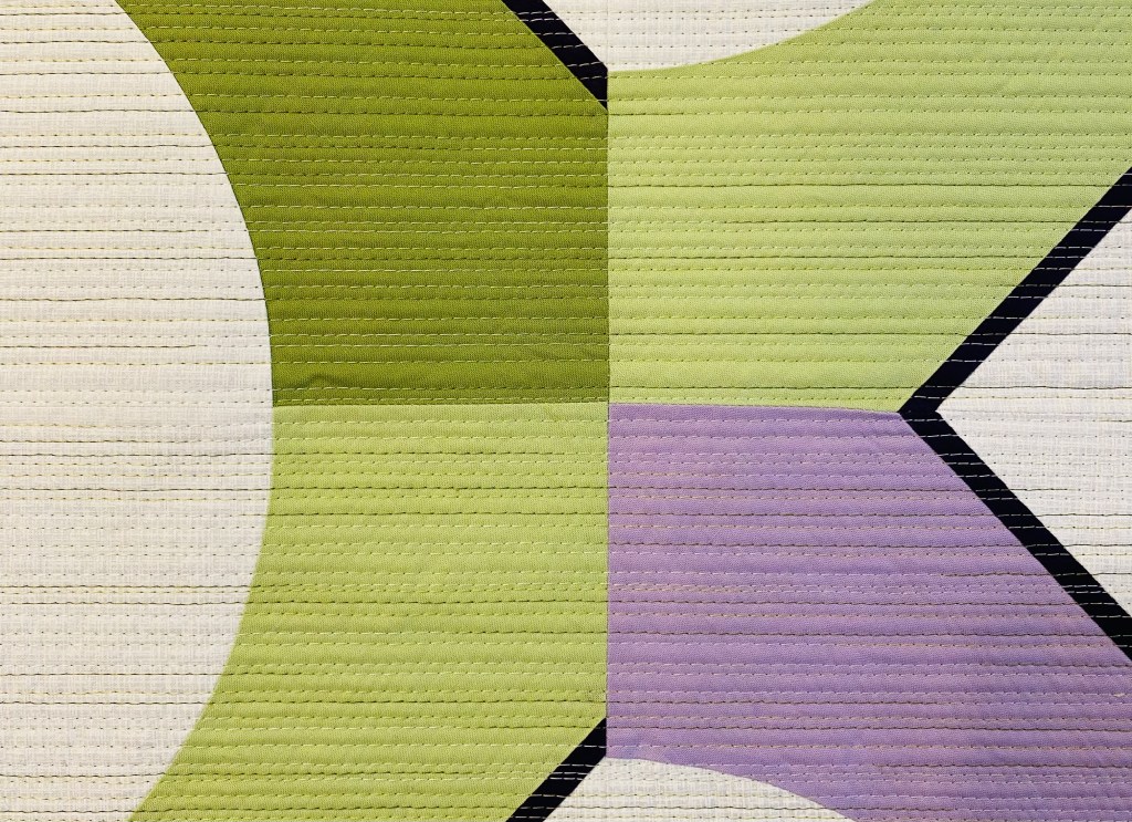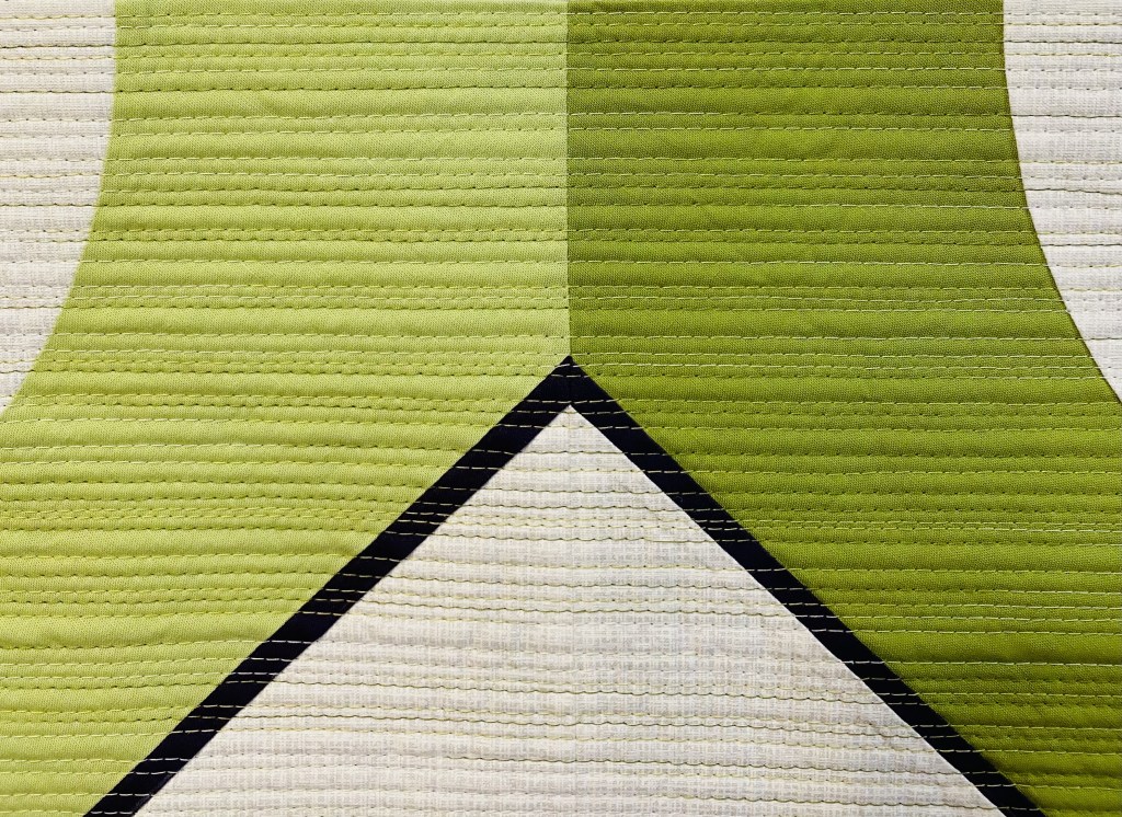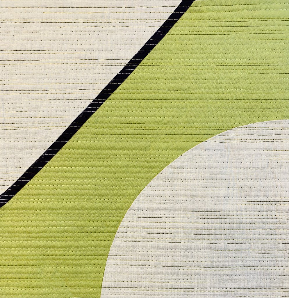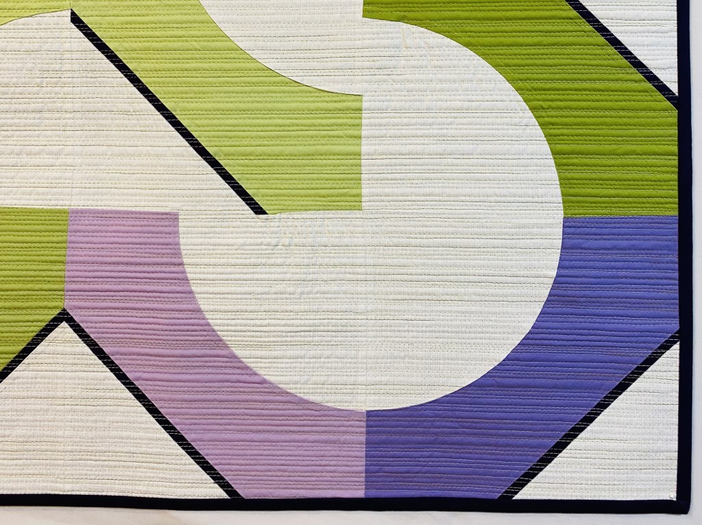 The expansive negative space is densely quilted with a variety of custom, hand guided quilting motifs. To highlight the large graphic design and add definition throughout the quilting, I used a heavy weight black thread to create the large circles, stars, double ended arrows and boarders that frame the asymmetrical design.